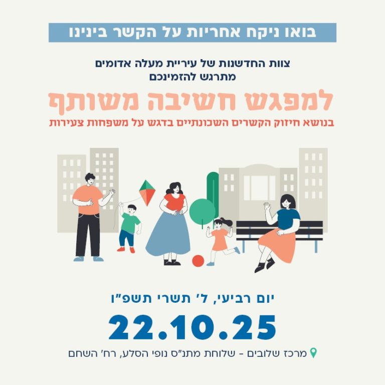 במפגש נשב בחמישה שולחנות עגולים ונחשוב יחד על מענים בנושא הקשר הדו כיווני בין הרשות לתושבים.